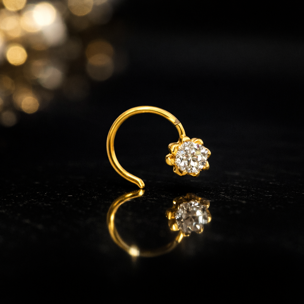 Available in 18KT, 14KT, and 9KT gold, this nose pin can be customized according to personal preference.