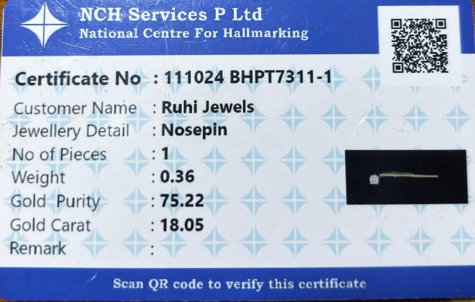 Crafted in approximately 0.34 grams of BIS Hallmarked 18KT gold, this nose pin is lightweight, comfortable, and ideal for everyday wear.