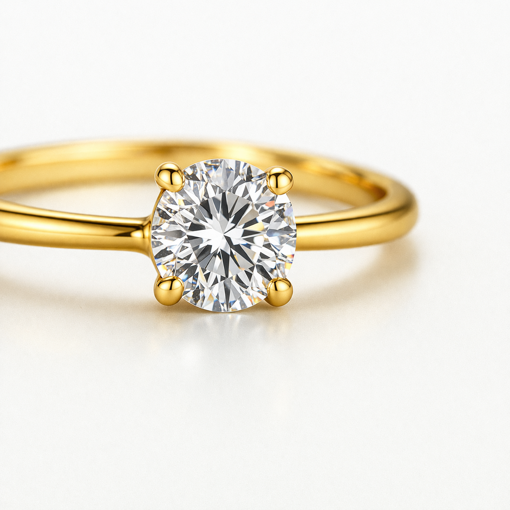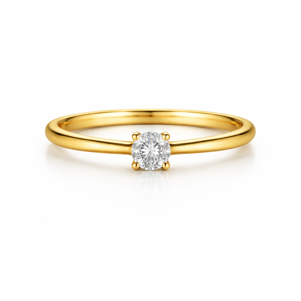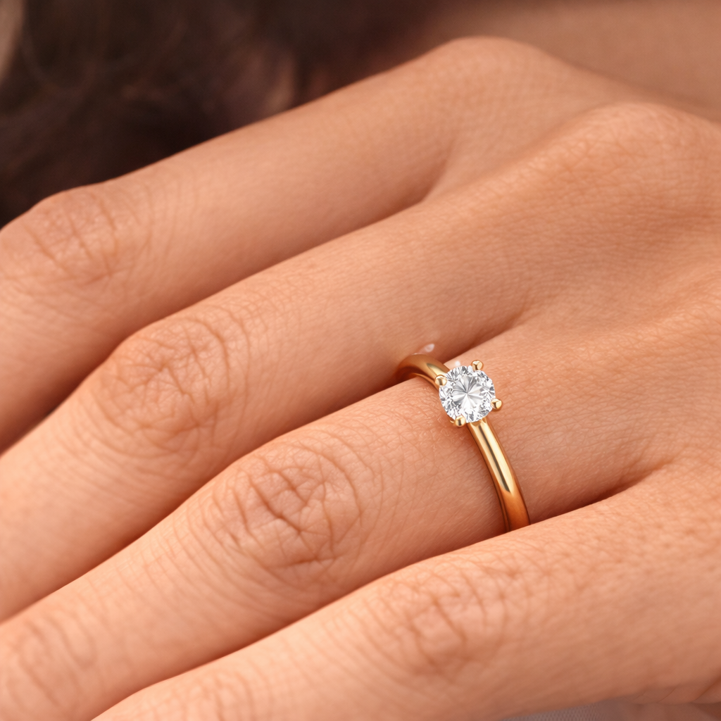 The ring features a round brilliant solitaire diamond, securely set in a classic prong setting that allows maximum light reflection and sparkle. Its minimal design highlights the beauty of the diamond, making it a perfect choice for those who appreciate understated luxury.